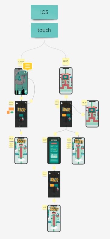 [from left to right: hub gameplay, wireframe for iOS, settings menu]